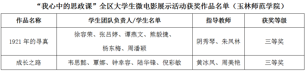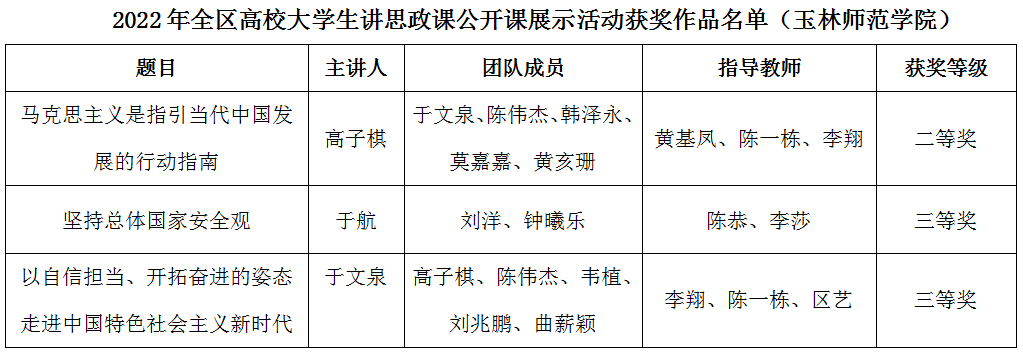 自治区教育厅下发《自治区教育厅关于公布习近平新时代中国特色社会主义思想大学习领航计划2022年系列主题活动获奖名单的通知》。在2022年全区高校大学生讲思政课公开课展示活动中,我校组建的3支团队在本科组64支团队中脱颖而出,获得二等奖1项、三等奖2项。在“我心中的思政课”全区高校大学生微电影展示活动中,我校组建的2支团队在本科组46支团队脱颖而出,获三等奖2项。
